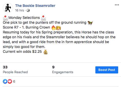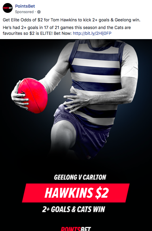 The first types of promotion I began to see were tipping pages attempting to sell their tips in exchange for money. The idea behind the marketing is simple, use emoji’s to gather their attention, a big attention grabbing photo with reference to the sport, and offer a code for exclusive promotions to their AFL and Racing tips. The majority of which show betting slips in their photos to entice the consumers, which to be fair they do a good job of. This type of marketing is affective and could easily draw in consumers like myself to click into their page and score more. For a paid advertising technique, I think this page did a very good job of being straight to the point and drawing the attention of customers. In terms of how engaging this type of post is for consumers, I believe people with interest in such services providers would be enticed in reading further into the page.